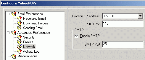 1) Use YPOPs! - This has to be 'enabled' as it's disabled by default. In our testing it's quite usable. Right click on the YPOPs! Tray Icon. Click on "Configure", expand "Advanced Preferences", and click on "Network" In the right section labeled "SMTP" place a check in the Enable SMTP checkbox. See below. Click OK.