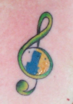 I designed this to be significant for my life with my husband. The G Clef represents music. Music is very important to me and is also one of the most significant things that Mike and I have in common. The color in the middle of the bottom of the G-clef is the icon of the software that we were both using when we met each other. Yes, we met on the web.....See front page for more info on that...